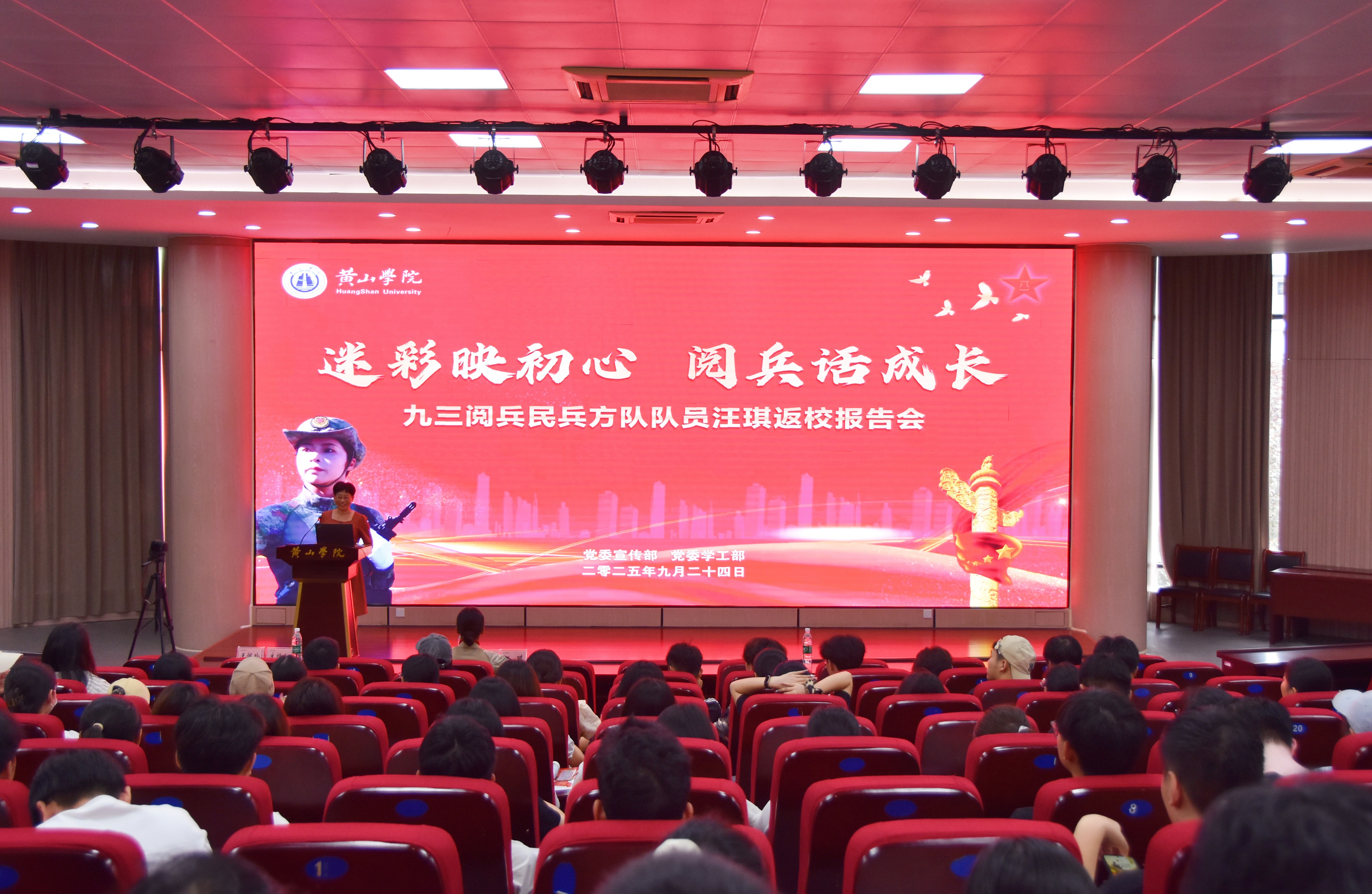 9月24日,我校在率水校区文端楼二楼报告厅举行九三阅兵民兵方队队员返校报告会。我校数学与统计学院2024届毕业生、九三阅兵民兵方队队员汪琪受邀作题为“迷彩映初心,阅兵话成长”的专题报告。全校200余名学生现场聆听报告,党委学工部负责人主持报告会。