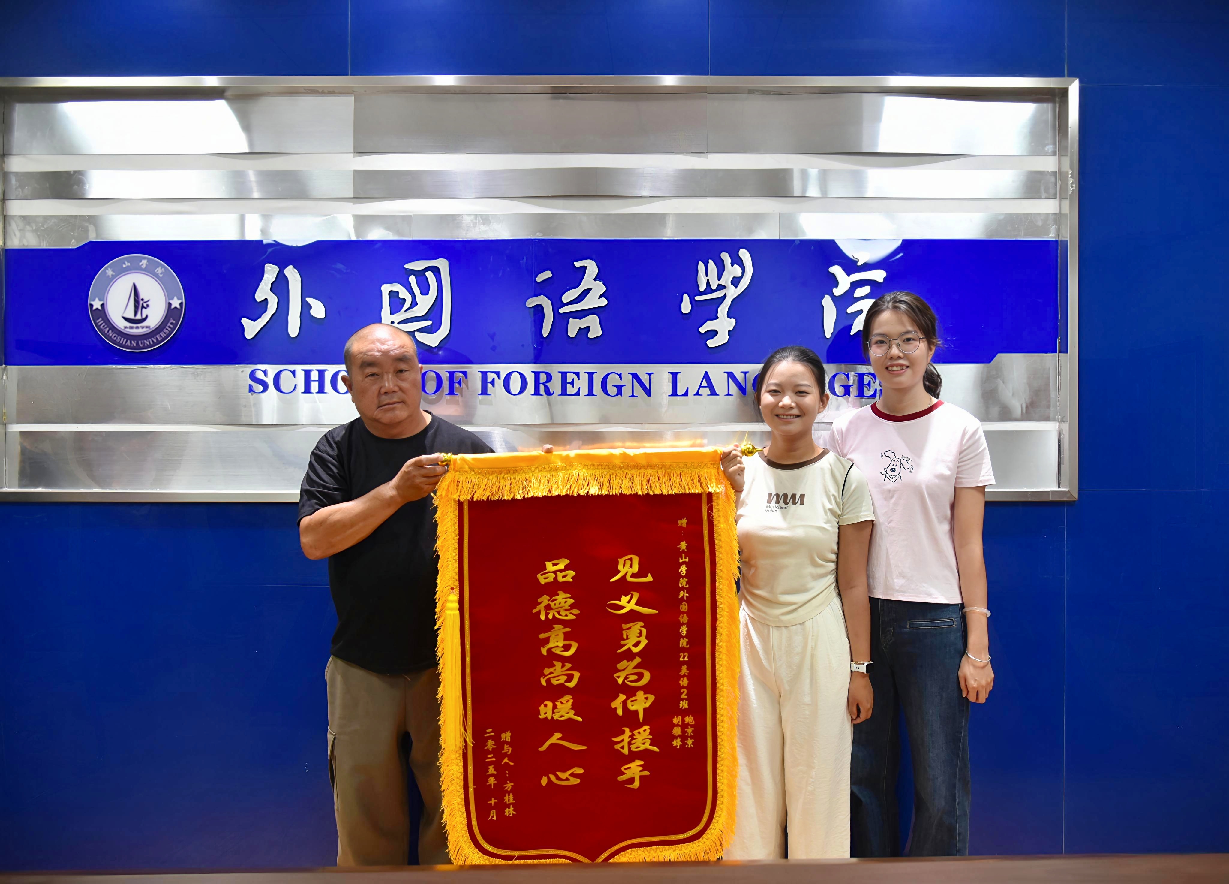 10月10日上午10点,一面印着“见义勇为伸援手,品德高尚暖人心”的鲜红锦旗,悄然送到了MK体育(中国)国际平台外国语学院22级英语2班鲍京京、胡雅婷同学手中。送旗人正是此前被救助的方先生,他辗转阳湖派出所、学校安全管理处等多地,终于找到在雨夜里为他伸出援手的两位女大学生。
