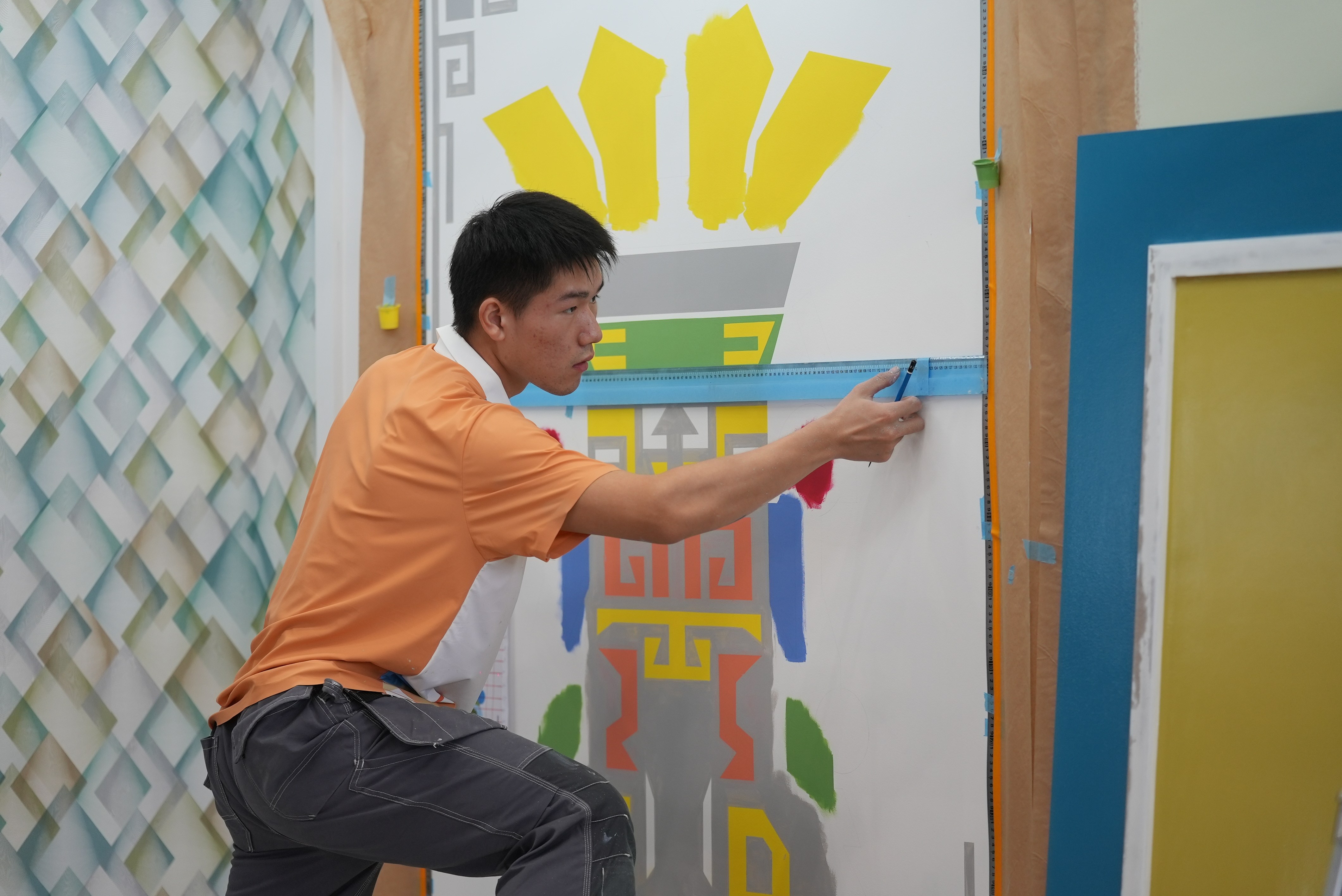 可真正的考验,在比赛第一天就悄然而至。“比赛第一天要完成墙纸,并且上午需要在墙纸裁边的门框滚涂一个颜色,但是覆盖度不是很好。”杨兆喜回忆道。这个看似简单的环节,却因漆料覆盖度不佳而变得棘手。为了达到效果,他上午反复滚涂了许多遍,却导致了更严重的问题——“下午开始准备贴的时候发现漆面没有干透”。
