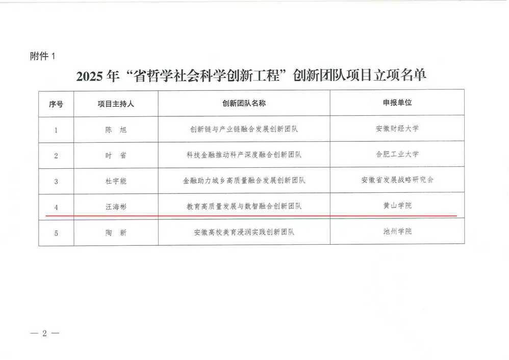 近日,安徽省社会科学界联合会公布了2025年度“省哲学社会科学创新工程”优秀青年人才及创新团队入选名单,我校汪海彬教授主持的“教育高质量发展与数智融合创新团队”成功入选。