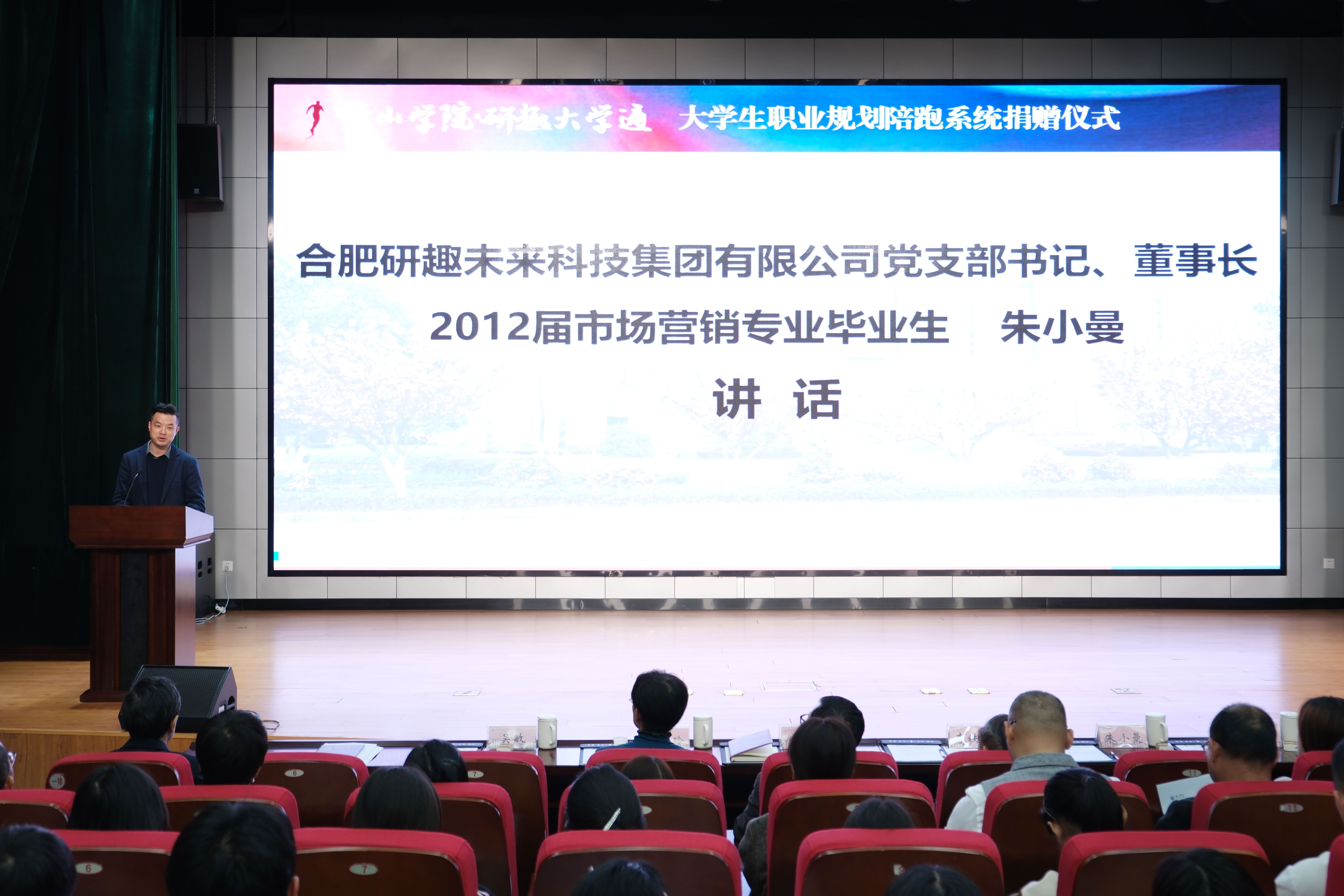 11月12日下午,MK体育(中国)国际平台·研趣大学通大学生职业规划陪跑系统捐赠仪式在我校横江校区报告厅举行。校党委书记李铁范,合肥研趣未来科技集团有限公司党支部书记、董事长、2012届市场营销专业毕业生朱小曼,该公司研究生事业部总经理、2014届环境科学专业毕业生王利娟出席捐赠仪式。发展规划与社会合作处、学生处等部门负责人,各学院分管学生工作副书记,经济管理学院领导班子成员、教师代表及学生代表参加仪式。仪式由经济管理学院负责人主持。