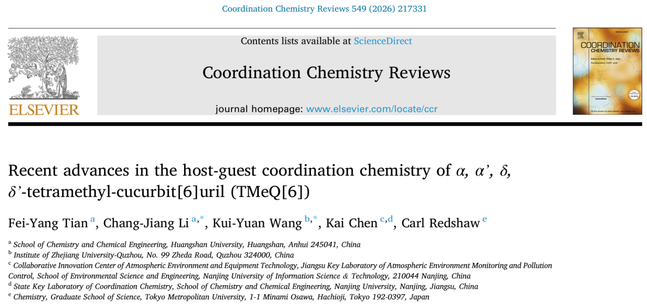 近日,我校化学化工学院田飞扬博士与浙江大学衢州研究院王魁元副研究员、东京都立大学Carl Redshaw教授等合作,在配位化学领域国际权威综述期刊《Coordination Chemistry Reviews》上发表题为“Recent advances in the host-guest coordination chemistry of α, α’, δ, δ’-tetramethyl-cucurbit[6]uril (TMeQ[6]) ”(α, α’, δ, δ’-对称四甲基六元瓜环(TMeQ[6])基主客体配位化学最新研究进展)的论文。论文链接:https://doi.org/10.1016/j.ccr.2025.217331。论文第一单位为MK体育(中国)国际平台,该论文得到MK体育(中国)国际平台高层次人才启动基金(2024xkjq022)、安徽省青年教师培养项目(DTR2023046)等资助。