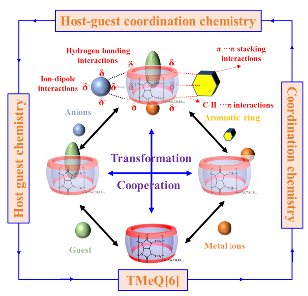 α, α ', δ, δ '-对称四甲基六元瓜环(TMeQ[6]),作为甲基修饰的改性瓜环,由于其独特的椭球结构和独特的外壁性质而引起了人们的广泛关注。这种改性瓜环可以通过主-客体相互作用与各种客体分子形成热力学稳定的包结物,同时也可以通过配位和氢键等非共价相互作用构建复杂的超分子框架。研究者系统地分析了TMeQ[6]介导的主-客体配位化学的最新进展,包括与有机小分子和金属离子的相互作用机制、配位作用模式以及在传感、分离、检测和催化方面的应用前景。此外,从动力学和热力学的角度分析了TMeQ[6]在超分子功能框架组装中的关键作用机制,并对未来的研究方向和应用潜力进行了展望,以期为超分子化学和材料科学的发展提供有价值的见解。