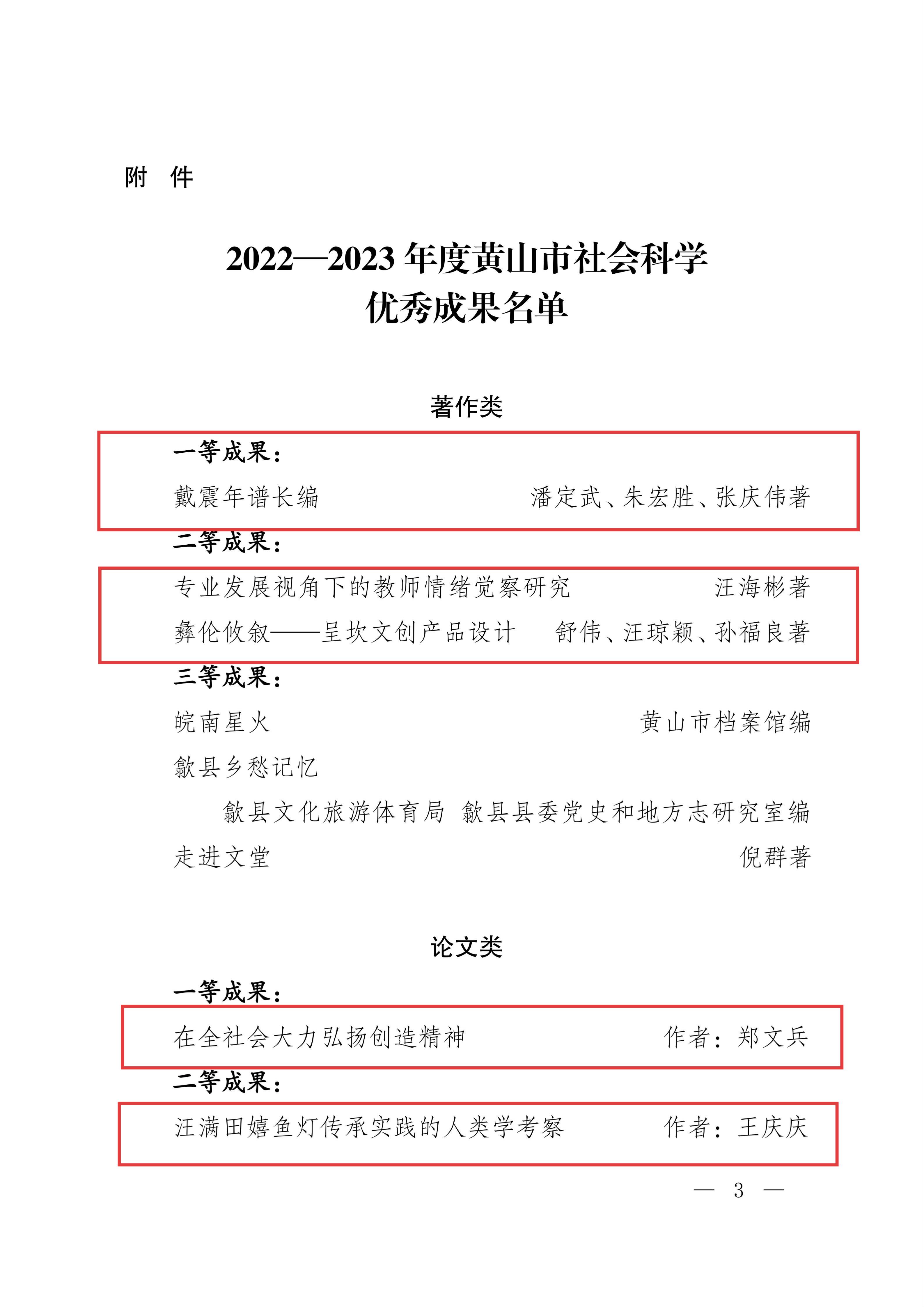 近日,2022—2023年度黄山市社会科学优秀成果奖评审结果公布,我校8项成果获奖。其中著作类一等奖1项,二等奖2项;论文类一等奖1项,二等奖1项,三等奖3项,在获奖质量和数量上较往届均有明显提升。