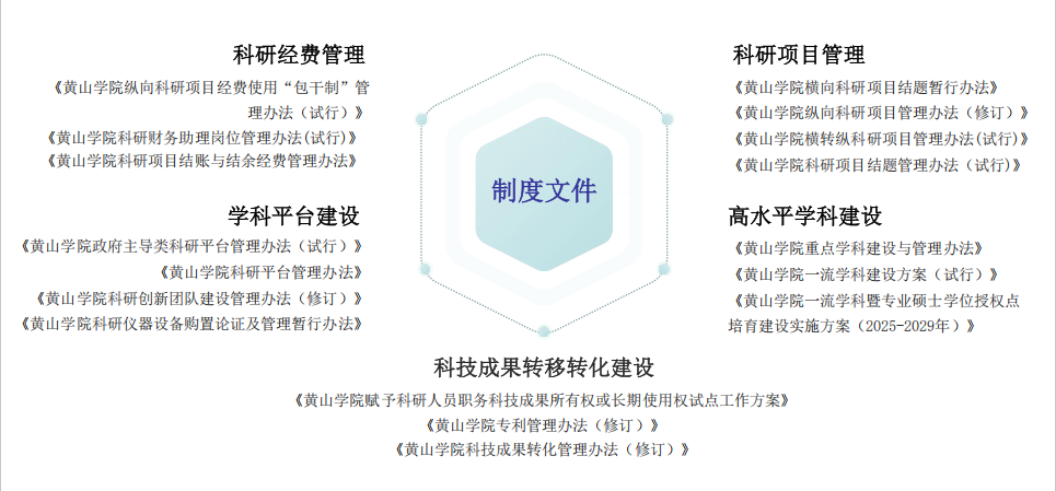 获批成立了安徽省重点培育智库——安徽省徽州文化研究中心、安徽省茶菊智能加工装备工程研究中心、安徽省功率集成电路工程研究中心、安徽省徽派建筑保护传承研究院、安徽省乡村振兴协同技术服务中心(培育)等11个省级科研平台,建立校市级科研平台59个。