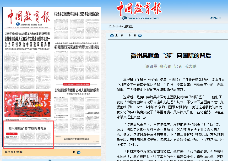 学校聚焦学科优势转化,主动对接地方实际需求,通过承担地方企事业单位横向课题、推进专利成果转化等方式,助力企业创新与乡村振兴,持续提升服务行业与区域经济社会发展能力。“十四五”期间,累计承担企事业科研合作项目1420项,合同总额2.1570亿元,横向到账经费13865.14万元。1名教师获评安徽省“双倍增两清零一提升”工作先进个人,绿色产业发展团队入选长三角科技志愿服务联盟优秀志愿服务组织,“培育‘高值’食用菌撑起乡村‘致富伞’”案例获批教育部精准帮扶典型项目。吴永祥博士团队历时8年科研攻坚,成功破解徽州臭鳜鱼工业化转型的核心难题,获全国同类首个精深加工PCT国际专利,相关成果获《中国教育报》头版报道,生动彰显了学校“产学研深度融合、精准服务地方发展”的办学特色。学校分析测试中心顺利通过CMA资质认证,取得检验检测机构资质,进一步为学校科研与地方产业高质量发展提供有力支撑。