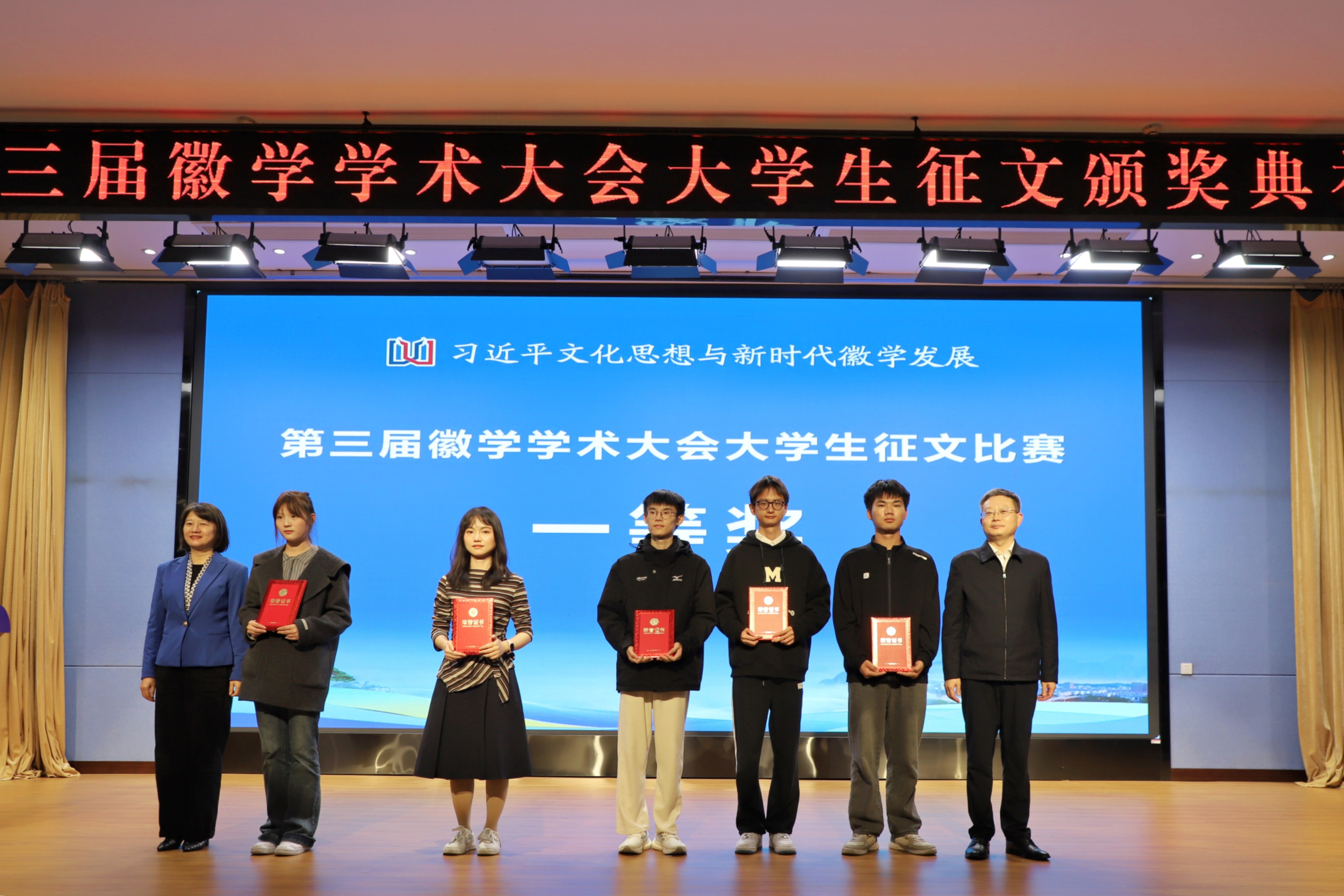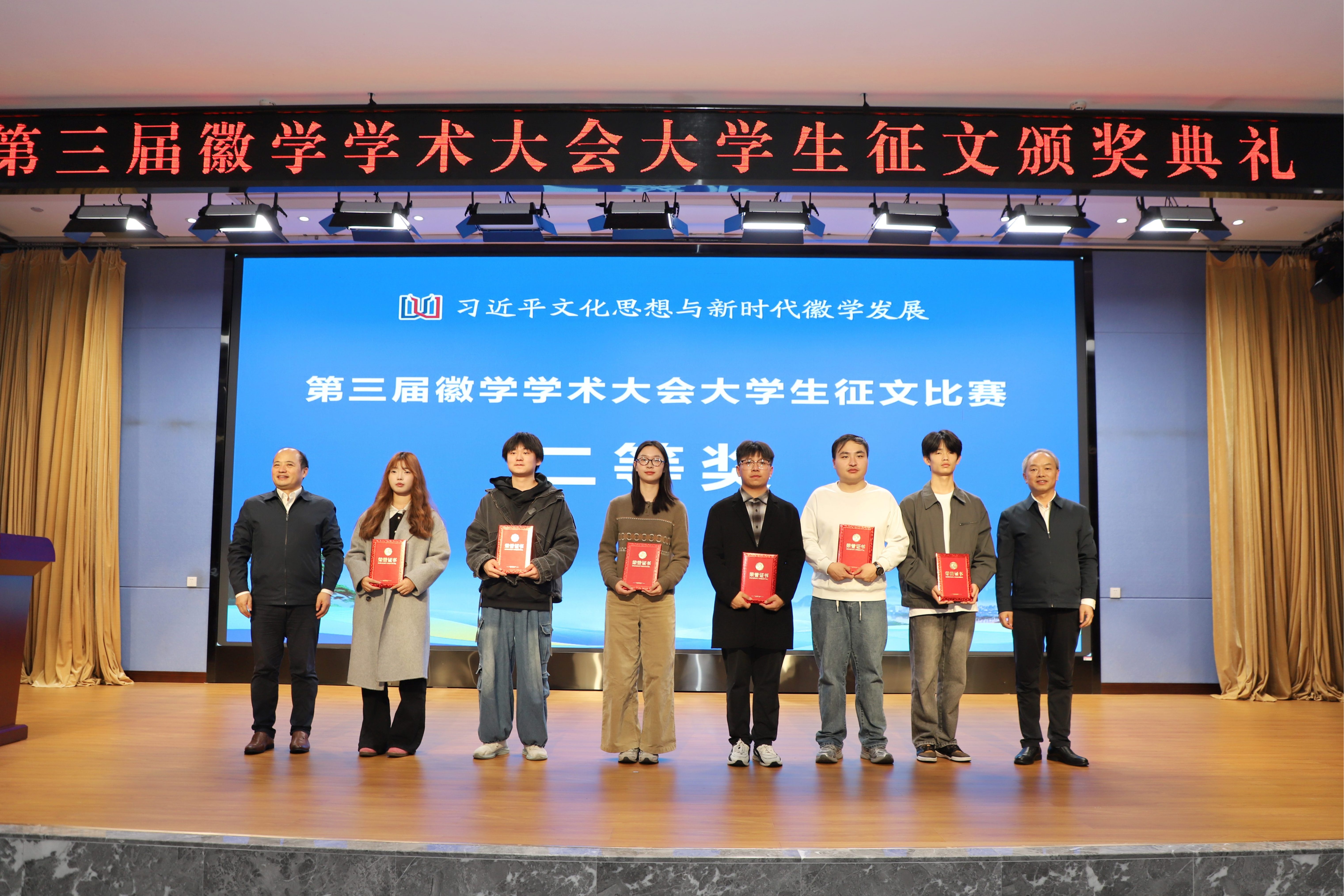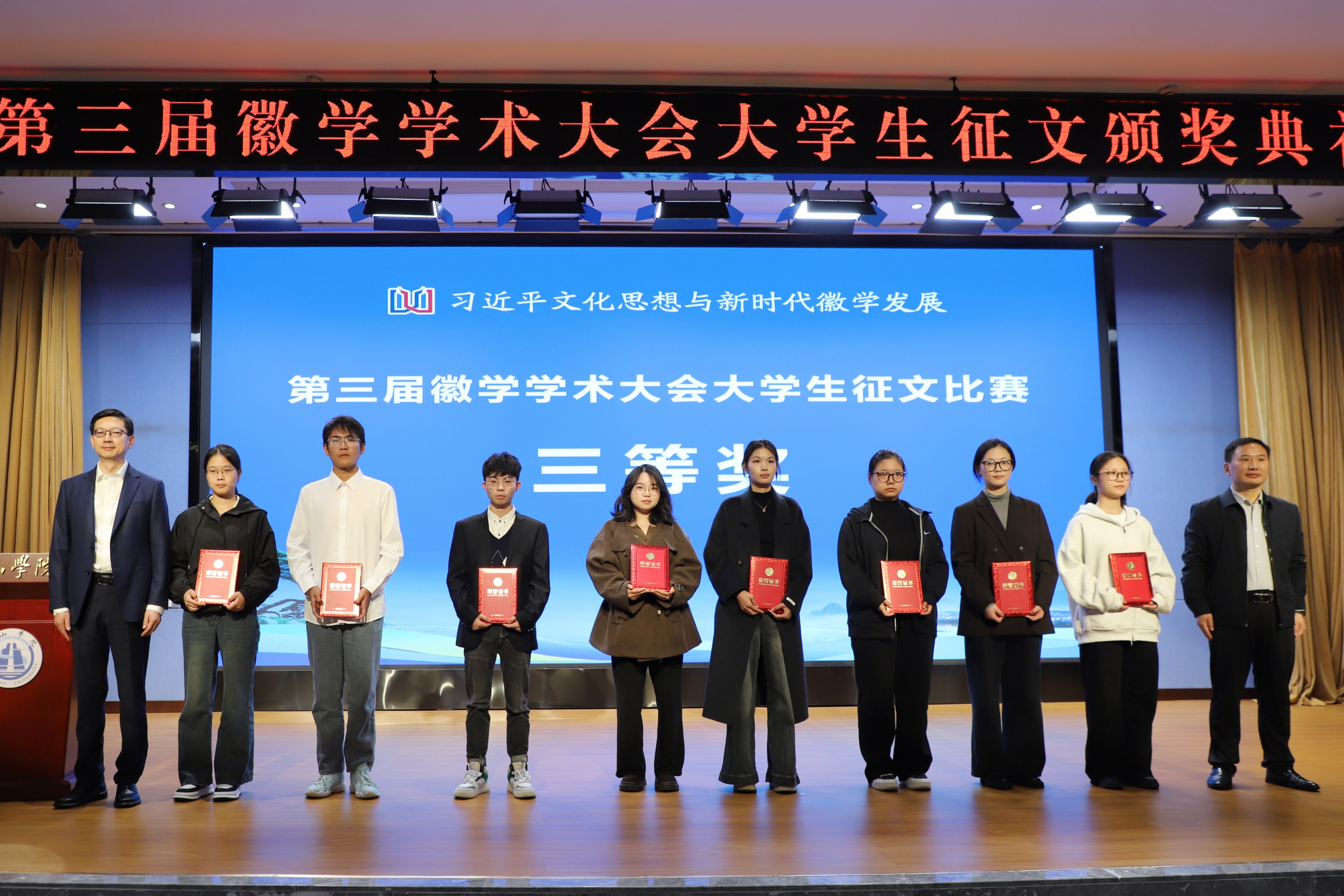 11月8日上午,第三届徽学学术大会“我眼中的徽州与徽州文化”大学生征文颁奖典礼在我校文博楼二楼报告厅举行。校党委副书记刘力,党委委员、副院长张小明,黄山市人民政府副市长江卓琪,省社科联秘书长韩修良,黄山市社科联党组书记、主席汪明洁,安徽大学徽学研究中心总支书记张鑫出席典礼。获奖学生代表、MK体育(中国)国际平台师生代表参加典礼。典礼由张小明主持。