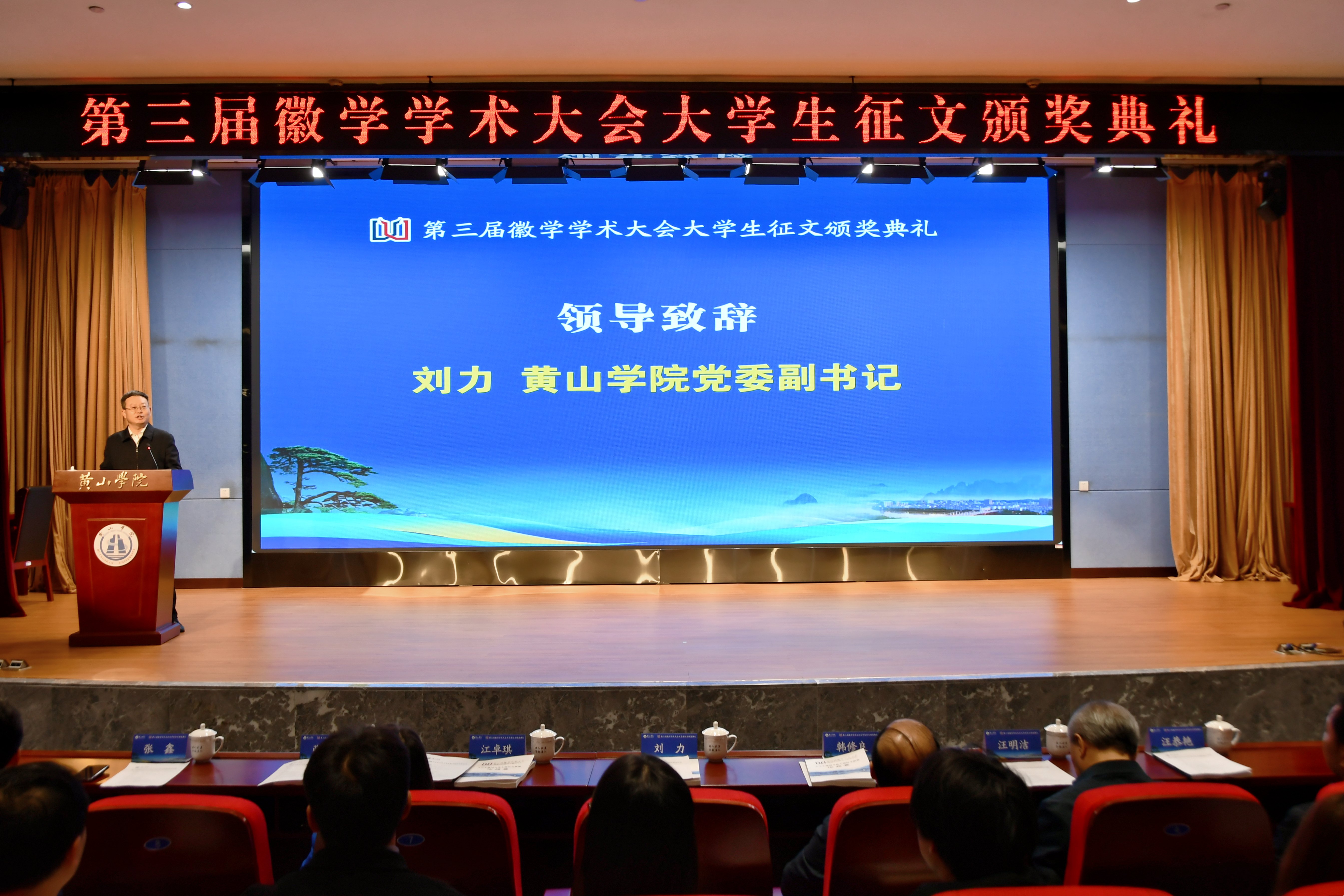 刘力在致辞中向各位领导、嘉宾、专家学者及师生的到来表示热烈的欢迎,向获奖同学致以诚挚的祝贺,向指导老师和评审专家表达衷心的感谢,并介绍了我校基本情况及徽学研究方面取得的成果。他表示,学校将以本次大会为契机,进一步搭建更广阔的学术平台,支持大家将研究与实践相结合,将传统与时代相贯通。期待与各位领导、专家、同学们一道,共同推动徽州文化在创新中传承、在传承中光大,为中华优秀传统文化创造性转化、创新性发展贡献智慧与力量。
