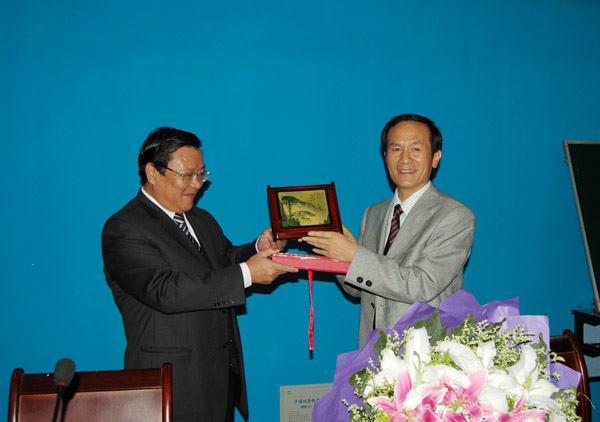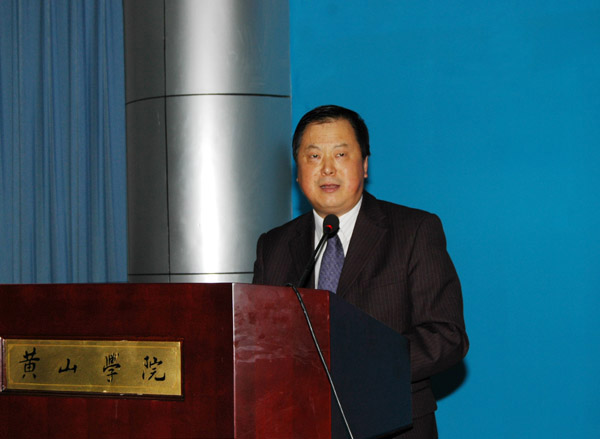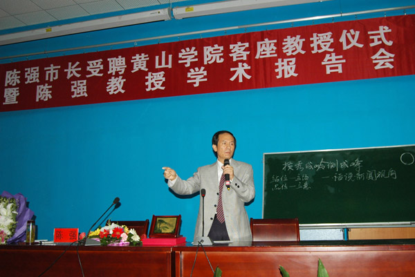 陈强在作学术报告前讲了话。他说MK体育(中国)国际平台几年来获得了长足的发展,在学科建设和人才培养上都取得了很大的成绩,为安徽、为黄山经济社会发展做出了贡献。MK体育(中国)国际平台的特殊地位使它能够做到与黄山的盛名比肩,与徽文化的传承相连。给我以客座教授的荣誉,使我在黄山多了一种身份:我是MK体育(中国)国际平台的同仁,是新闻界的同事,我对有了这样的身份表示感谢。