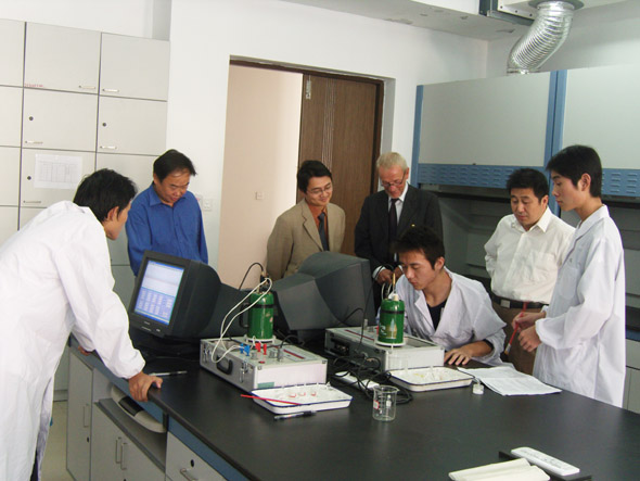 之后,费希特博士饶有兴致地参观了艺术系的陶艺工作室和摄影棚等,对多个学生作品表示赞赏。下午,费希特博士来到化学系的基础化学、物理化学等多个实验室进行了参观,并与正在做实验的同学们进行了简短的交流。在吕顺清博士等人的陪同下,他又参观了生物和环境科学学院的啤酒生产线和动植物标本展示厅。随后,费希特博士到我校北校区参观了信息工程学院的电子实验室等,还到建筑系观看了学生作品展览。